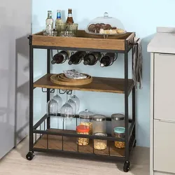 רטרו כפרי 3 שכבות mdf עליון מטבח עץ מתלה מחסן טרולי בר עגלת יין עם מחזיק כוסות